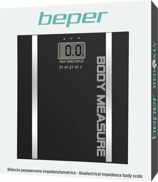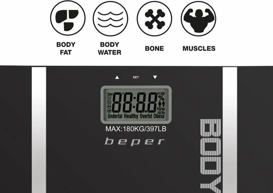 Elektronische weegschaal met 6 mm dik platform van gehard glas. Dankzij de metalen inzetstukken, die uw gegevens invoeren, berekent het de spieren en botmassa, het percentage vloeistoffen met een capaciteit tot 10 geheugens.