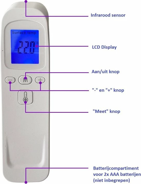 - De infrarood thermometer is uitgerust met de zeer gevoelige infrarood microprocessor en LCD display. Het kan snel en nauwkeurig de temperatuurwaarde aflezen.