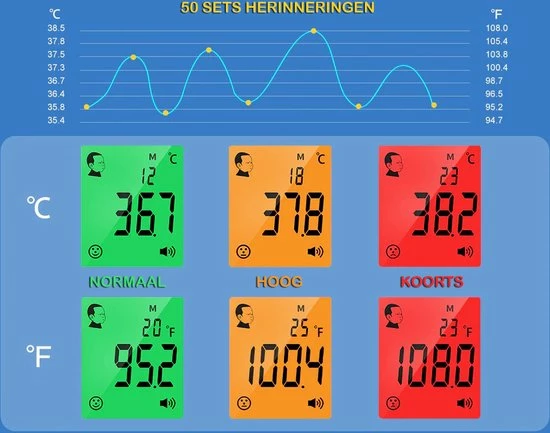 Gemakkelijk (50 sets) om te herinneren, intelligente koorts alarm (Over 38.0 ?/100.4 ?F) met geluid aanpassing (Ondersteuning stille modus).
