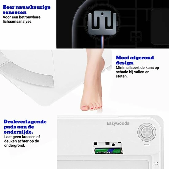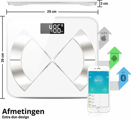 Op de slimme weegschaal zitten vier metalen platen die je lichaamssamenstelling analyseren door middel van de populaire en accurate methode ?Bioelectrical Impendence Analyse? (BIA).