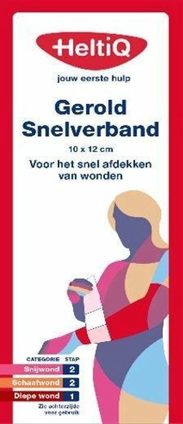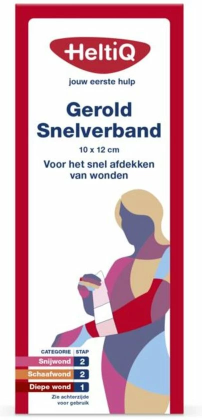 HeltiQ Gerold Snelverband is een fixatiewindsel met een niet verklevend wondkussen in ??n, waarmee op een snelle manier sterk bloedende wonden steriel kunnen worden afgedekt. Het snelverband heeft een hoog absorptievermogen, is sterk, zacht, hypoallergeen en ventilerend.