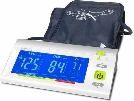 De automatische bloeddrukmeter meet hypertensie, hypotensie en uw polsslag. De informatie is eenvoudig af te lezen. Dankzij de kleurenindicator weet uw direct als alles normaal is. Het toestel voldoet aan de richtlijnen van de WHO. De meting is totaal automatisch. Het toestel detecteert aritmie. De bijgeleverde manchet is standaard en past om arm van 22-32cm. De informatie is dankzij de grote cijfers gemakkelijk af te lezen. Het toestel beschikt over 120 geheugenplaatsen voor 2 gebruikers.