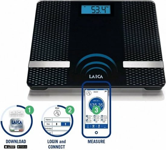 - De weegschaal vergemakkelijkt het gewicht tot 180 kg. en andere gegevens over de lichaamssamenstelling, stuur ze via Bluetooth naar je mobiele telefoon, waar je ze in de Laica Home Wellness-app kunt zien. Je kunt alle gebruikers in de gratis app downloaden (Google Play of App Store)