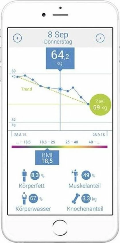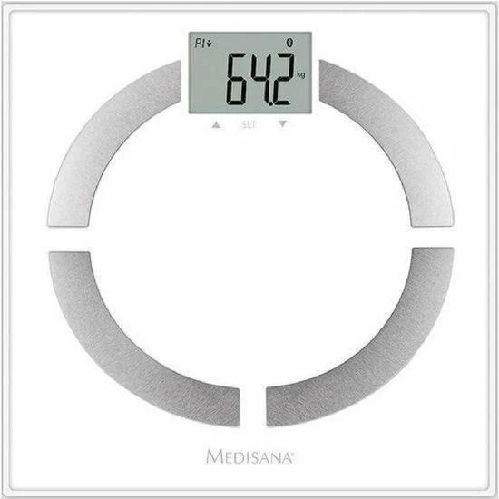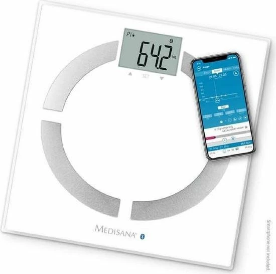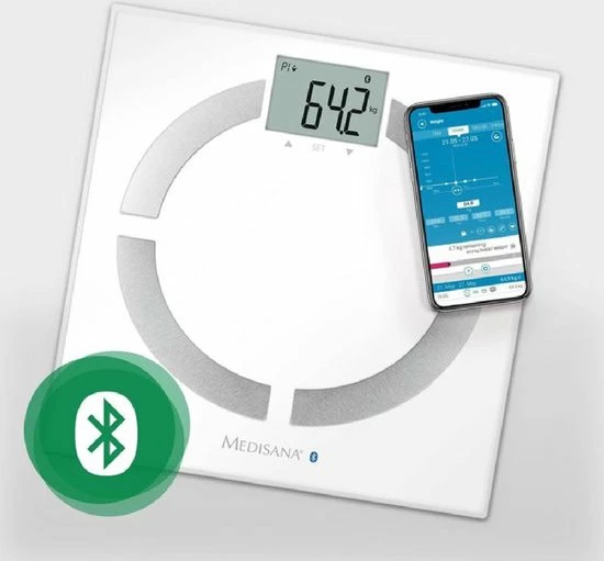 Op zoek naar een lichaamsanalyse weegschaal die meer meet dan alleen je geiwicht en bmi? Dan is de Medisana BS444 Connect Lichaamsanalyseweegschaal met app iets wat je zoekt! Naast lichaamsgewicht en BMI meet de BS 444 Connect ook je vetpercentage, vochtpercentage, en je spier- en botmassa. Samen met de BMI-berekening en vaststelling van de dagelijkse caloriebehoefte helpt deze Lichaamsanalyseweegschaal met app je naar een effici??nter gezondheidsschema.