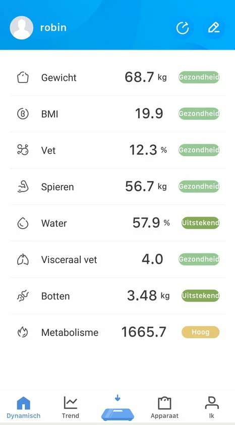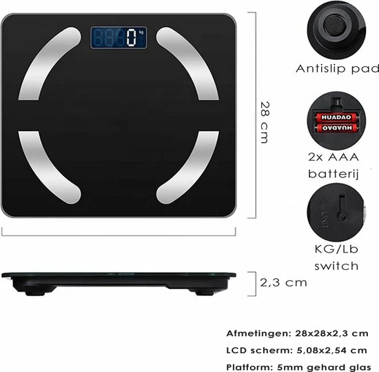 Kortom, deze lichaamsanalyse weegschaal is onmisbaar wanneer jij werkt aan jouw gezondheid en gewicht. De weegschaal verbind je gemakkelijk via Bluetooth met verschillende slimme weegschaal apps in de Apple Appstore en Android Google Play Store. Bijvoorbeeld de OKOK international app (NL-talig). De weegschaal houdt i.c.m. de app jouw gewicht, BMI, BMR, vetpercentage, visceraal vetpercentage, waterpercentage, spiermassa, botmassa en calorie behoefte bij. Zo heb je altijd inzicht in jouw vooruitgang! Tevens heb je zo altijd een duidelijk overzicht in jouw vorderingen over de tijd. De app geeft je ook de mogelijkheid je vooruitgang te delen via sociale media kanalen en kan connecten met Google Fit.