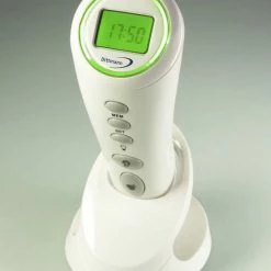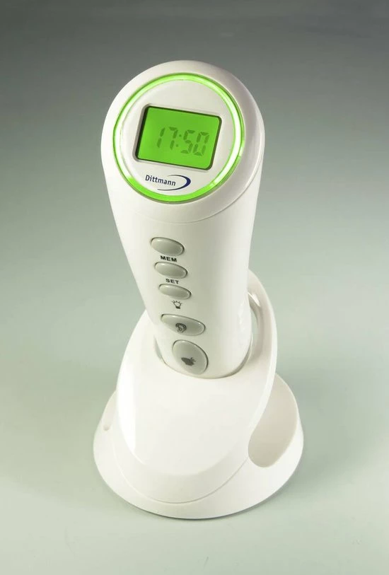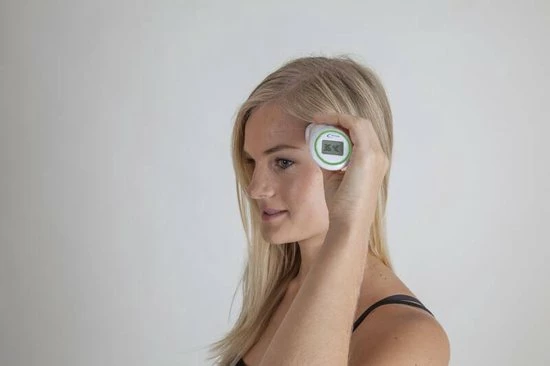 Met deze infraroodthermometer kunt u eenvoudig en nauwkeurig uw lichaamstemperatuur meten. Met twee instelmogelijkheden kan de temperatuur op het voorhoofd of in het oor worden gemeten. Als de meting voltooid is klinkt er een akoestisch signaal en wordt het resultaat op het digitale display weergegeven. Bij verhoogde temperatuur/koorts licht de buitenste ring rood op. De laatste 9 metingen worden opgeslagen met datum en tijd zodat u gemakkelijk verschillende metingen kunt vergelijken. Het apparaat geeft ook een waarschuwing als reiniging nodig is om een foutloze meting te garanderen. De temperatuurweergave kan worden omgeschakeld tussen Celsius en Fahrenheit.