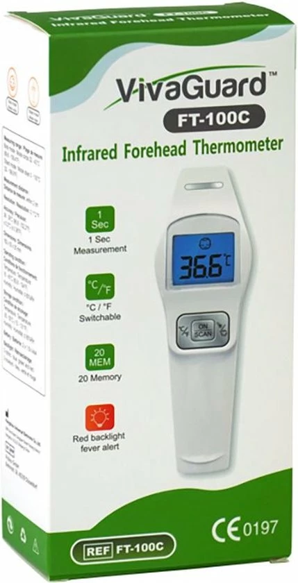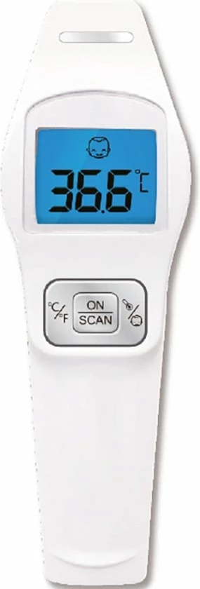 Deze contactloze infraroodthermometer is ontworpen om de contacttemperatuur op het voorhoofd te meten bij volwassenen, kinderen en zuigelingen zonder contact. Het kan ook oppervlakte- en omgevingstemperaturen meten. Het nemen van temperatuur is snel, veilig, eenvoudig, nauwkeurig en hygiënisch zonder de patiënt te hoeven storen. Houd de thermometer gewoon binnen 5-10 cm van het voorhoofd en druk op de SCAN-knop. Resultaten zijn beschikbaar in Fahrenheit of Celsius en worden binnen een seconde weergegeven op het grote LCD-scherm. De klinische nauwkeurigheid voor lichaamstemperatuur ligt binnen 0,2 ° C (0,4 ° F). Het apparaat slaat de laatste 12 resultaten op en wordt automatisch uitgeschakeld na 60 seconden niet-gebruik om de batterij te sparen incl 2 AAA-batterijen.
