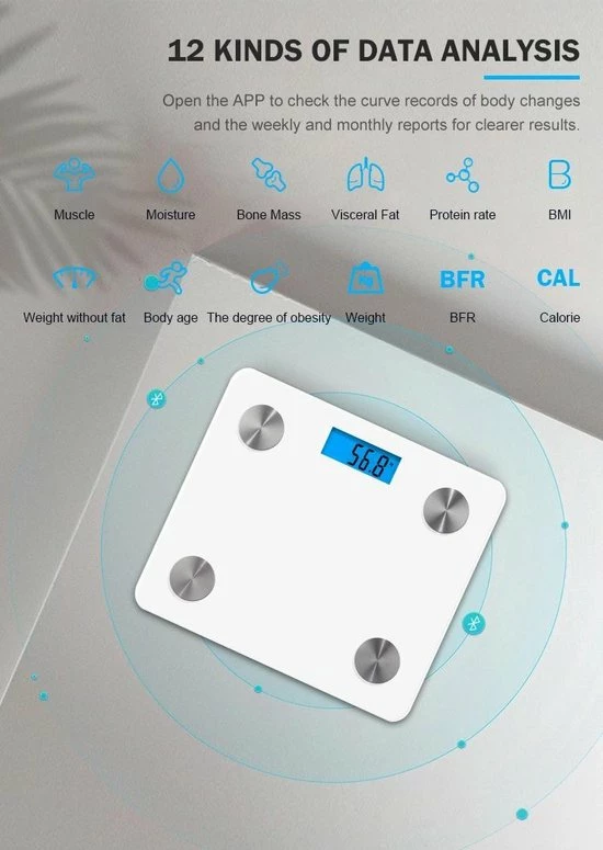 Deze slimme weegschaal kan binnen een paar seconden een uitvoerige lichaamsanalyse voor je uitvoeren via de twee sensoren onder je voeten. De app slaat je gegevens op in een handig overzicht dat je op je smartphone kan bekijken. Hierbij zie je naast je gewicht, onder andere ook je vetpercentage, je percentage spieren en botten, je BMI en je lichaamsleeftijd. Deze weegschaal is erg gebruiksvriendelijk. Zodra hij uit de verpakking is gehaald kunt u hem meteen gebruiken.