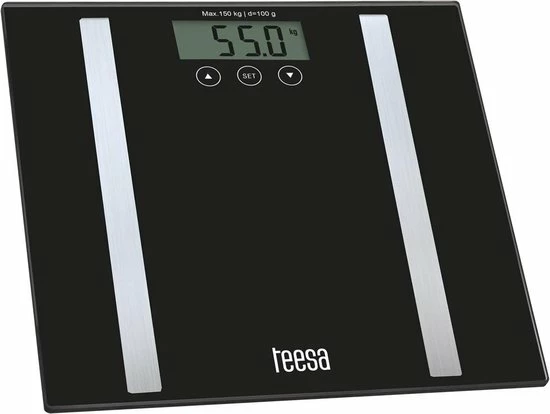 De TSA0802 digitale personenweegschaal van Teesa met LCD-display is een weegschaal met lichaamsanalyse. De weegschaal meet uw gewicht tot op 100 gram nauwkeurig. Daarnaast toont de TSA0802 o.a. vochtbalans, vetpercentage en het percentage van uw spieren en botten. Ook berekent deze digitale weegschaal uw BMI en minimale dagelijks benodigde calorie?n. De weegschaal heeft een opslagcapaciteit voor 10 gebruikers, zodat het hele gezin gebruik kan maken van alle mogelijkheden van dit apparaat. Blijf fit met de TSA0802.