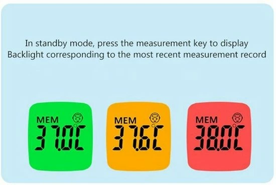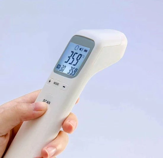 Veilige contactloze infrarood thermometer. Binnen 1 seconde de uitslag zonder in contact te komen met de persoon. De thermometer geeft in kleurschema’s aan of de persoon koorts heeft. De thermometer wordt geleverd met batterijen.